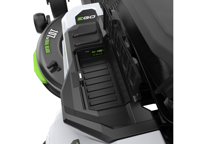 Die LCD-Benutzeroberfläche ist intuitiv gestaltet, sodass Sie das Tempo, die Fahrweise und die Schneidegeschwindigkeit steuern können. Der Bildschirm zeigt auch den Akkustand an. Sie haben die Wahl zwischen drei Fahrweisen. Der Standardmodus eignet sich für alltägliche Aufgaben. Im Kontrollmodus wird die Grasnarbe geschont und können neue Zero-Turn-Benutzer sich mit dem Gerät vertraut machen. Im Sportmodus führt der Rasenmäher Präzisionsschnitte in scharfen Kurven aus. Außerdem verfügt das Gerät über Bluetooth, so dass Sie ihn über Ihr Mobiltelefon fernsteuern können. Sie haben das Mähen voll unter Kontrolle, können Ihren Akku überwachen und Firmware-Updates mit den neuesten Funktionen herunterladen. Sie verfügen für die Schnitthöhe über 10 Stufen von 2,5 bis 10 cm. Die Schnitthöhe stellen Sie einhändig an den ergonomischen Handgriffen ein. Sie haben die Wahl zwischen Mulchen, Aufsammeln oder seitlichem Auswurf während des Mähens. Sie bekommen nicht nur den perfekten Cut, sondern wissen auch, wohin mit dem Schnittgut.(Ein Fangkorbaufsatz separat erhältlich) Das ist noch nicht alles: 32 lichtstarke LED-Leuchten verbessern Ihre Sicht, wenn die Bedingungen schwieriger werden. Das Gerät besitzt auch einen Getränkehalter für große Becher, damit Sie während der Arbeit immer genug trinken können. Außerdem gibt es ein Staufach mit einem Steckplatz für Ihr Mobiltelefon, das Sie über den praktischen USB-Anschluss auch während der Fahrt aufladen können.